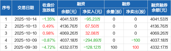 严牌股份:融资净偿还95.23万元,融资余额4041.53万元(10-14)