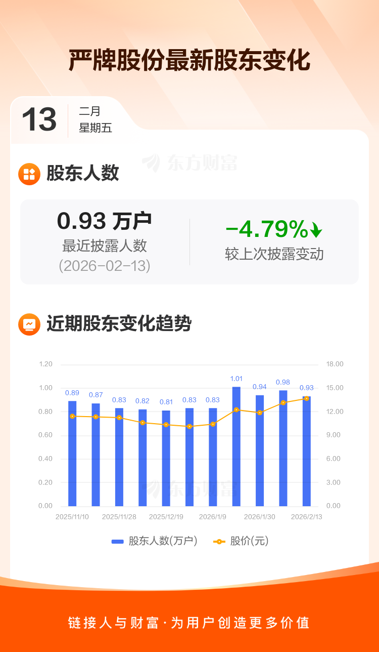 严牌股份:截至2月13日最新股东户数9311户,较上期减少4.79%