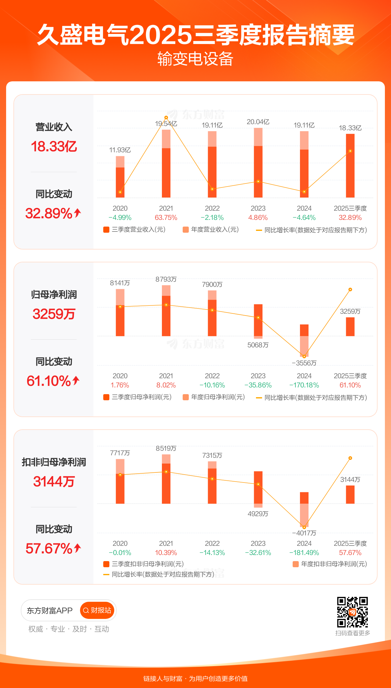 久盛电气10月30日发布2025年三季报显示,公司前三季实现营业收入18.33亿元,同比增长32.89%;归母净利润3258.55万元,同比增长61.10%;扣非归母净利润3143.75万元,同比增长57.67%。