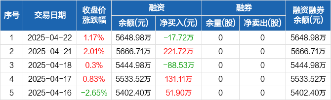 百胜智能:融资净偿还17.72万元,融资余额5648.98万元(04-22)