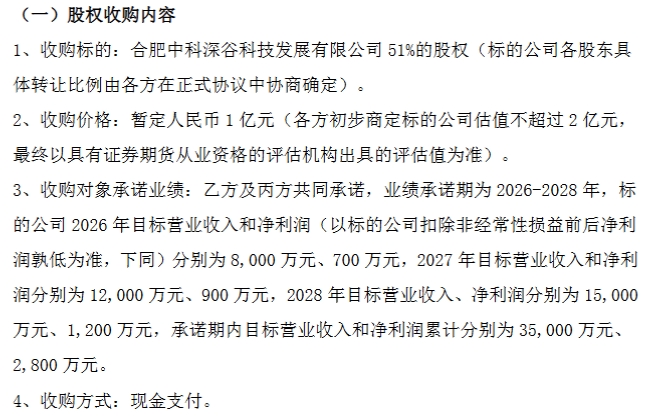 根据协议,中科深谷承诺2026年营业收入8000万元、净利润700万元;2027年营业收入1.2亿元、净利润900万元;2028年营业收入1.5亿元、净利润1200万元,三年累计承诺营业收入3.5亿元、净利润2800万元。业绩未达标时,转让方需用保证金补偿。