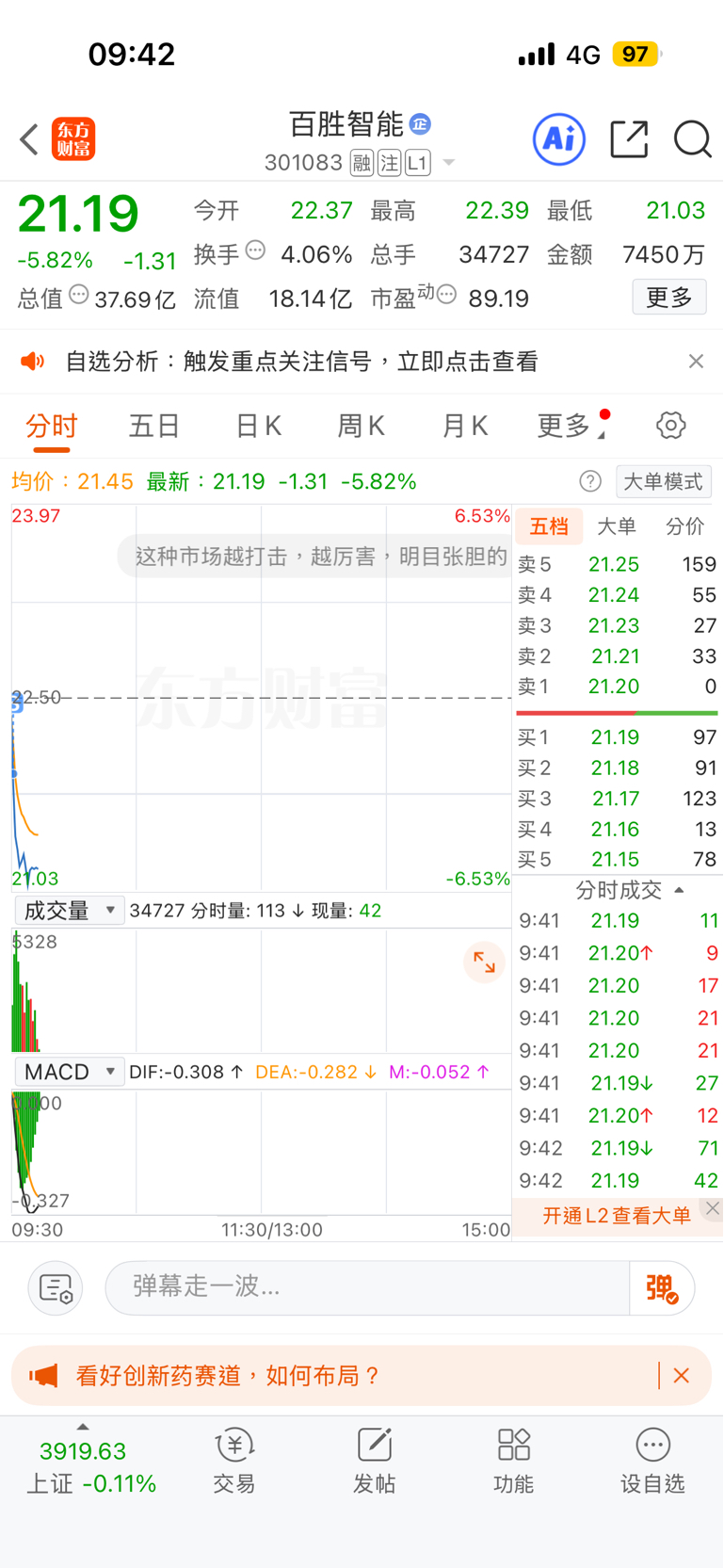 $百胜智能(SZ301083)$ 等破位,没想到连反抗一下都没有直接破22,走了兄弟们