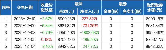 百胜智能:融资净买入227.32万元,融资余额8909.16万元(12-10)