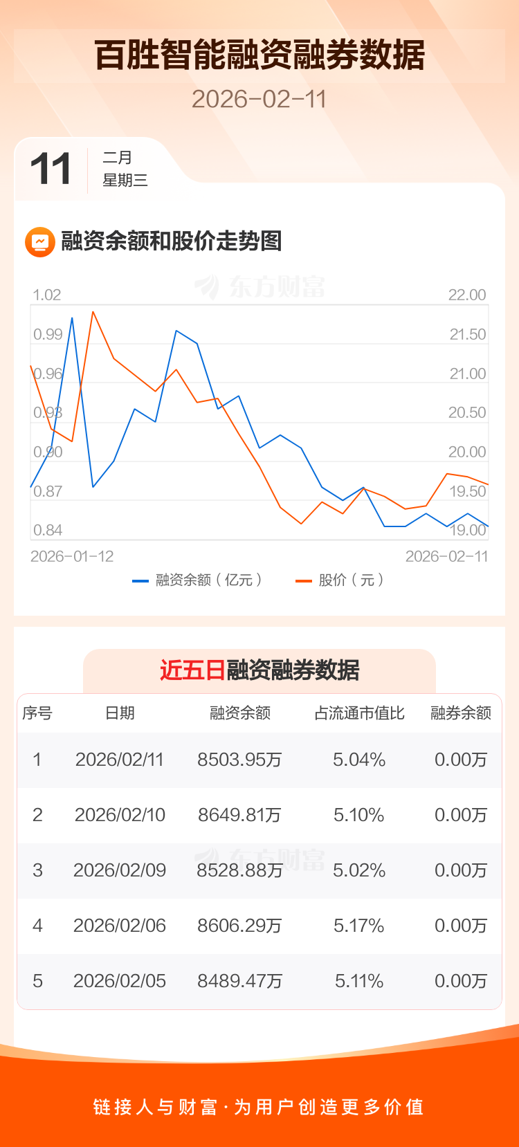 交易所最新数据显示,百胜智能于2026年2月11日获融资买入330.45万元,融资偿还476.31万元,当日融资净偿还145.86万元。目前,该股融资余额8503.95万,占流通市值比例为5.04%。