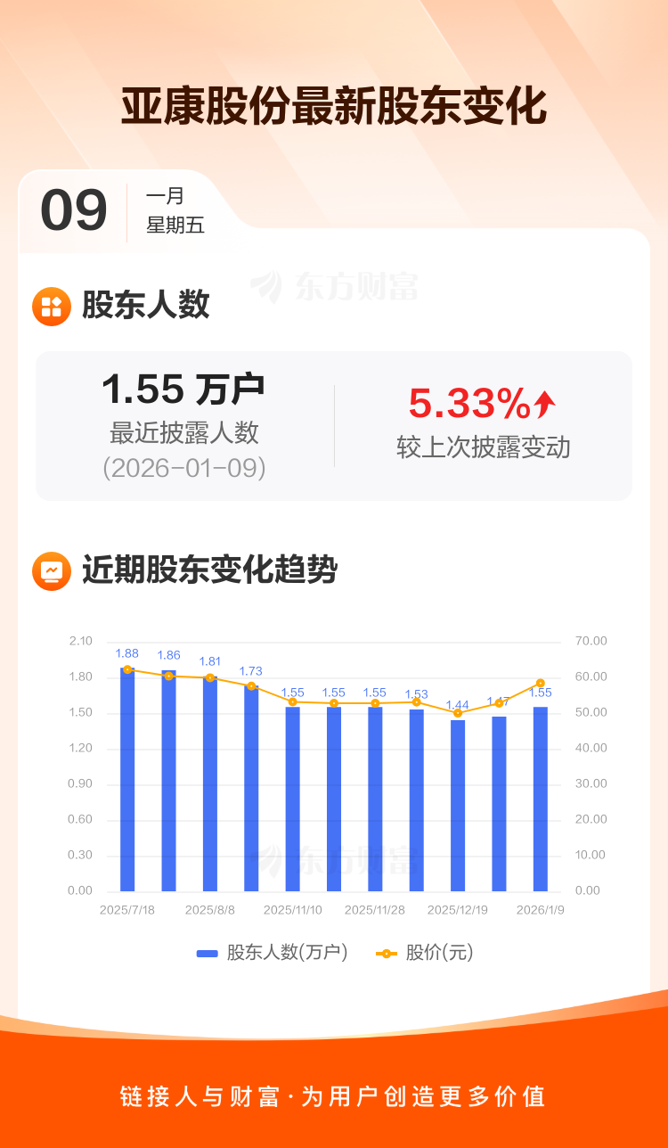 亚康股份:截至1月9日最新股东户数1.55万户,较上期增加5.33%