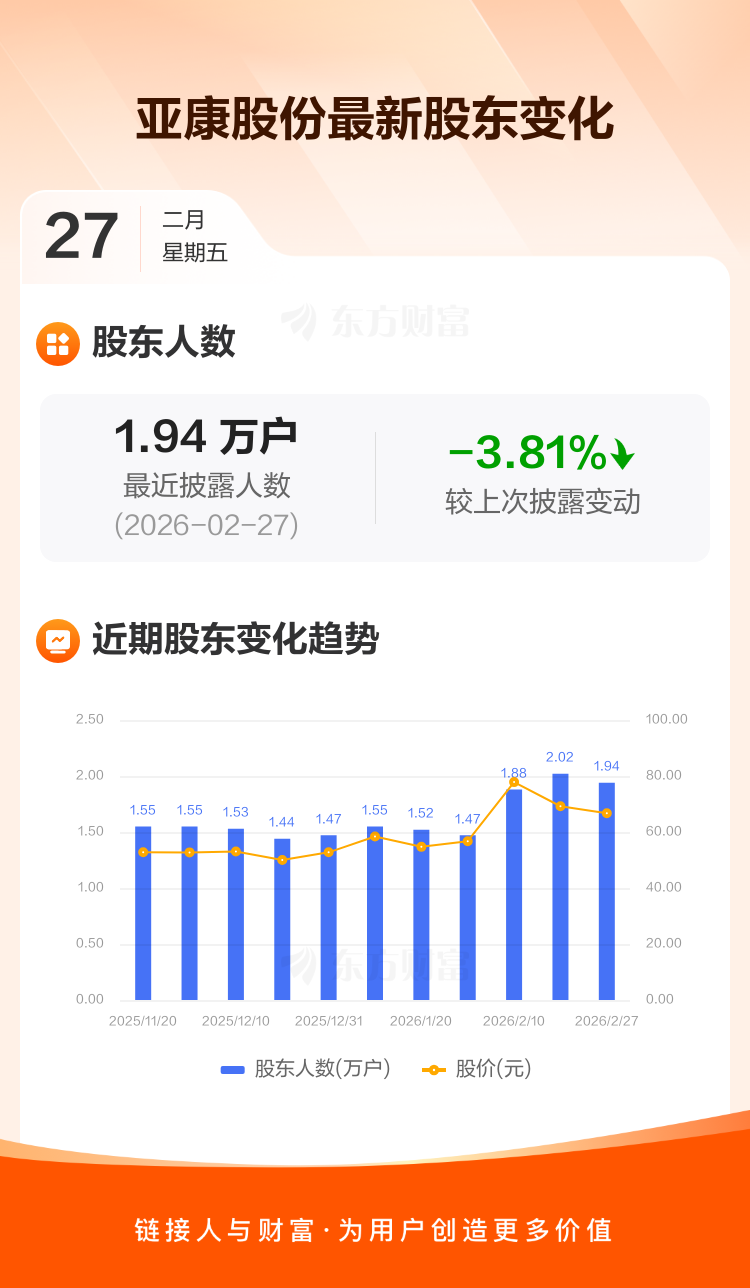亚康股份:截至2月27日最新股东户数1.94万户,较上期减少3.81%