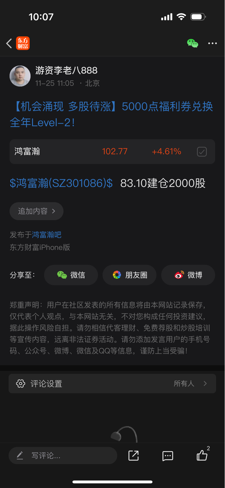 温馨提示: 1.根据《证券法》规定,禁止编造、传播虚假信息或者误导性信息,扰乱证券市场;2.用户在本社区发表的所有资料、言论等仅代表个人观点,与本网站立场无关,不对您构成任何投资建议。用户应基于自己的独立判断,自行决定证券投资并承担相应风险。《东方财富社区管理规定》