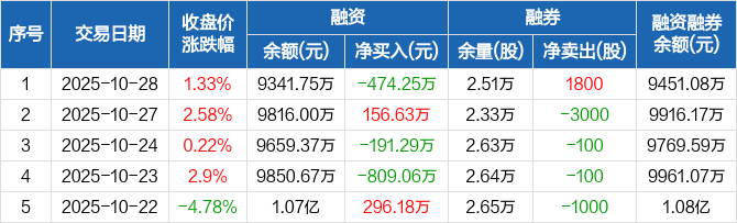 融资方面,当日融资买入532.47万元,融资偿还1006.73万元,融资净偿还474.25万元。融券方面,融券卖出3100股,融券偿还1300股,融券余量2.51万股,融券余额109.33万元。融资融券余额合计9451.08万元。