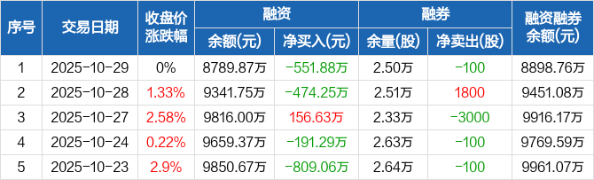 融资方面,当日融资买入307.1万元,融资偿还858.98万元,融资净偿还551.88万元。融券方面,融券卖出300股,融券偿还400股,融券余量2.5万股,融券余额108.9万元。融资融券余额合计8898.76万元。