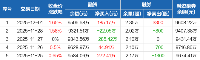 融资方面,当日融资买入687.55万元,融资偿还502.37万元,融资净买入185.17万元。融券方面,融券卖出3800股,融券偿还500股,融券余量2.35万股,融券余额101.54万元。融资融券余额合计9608.22万元。