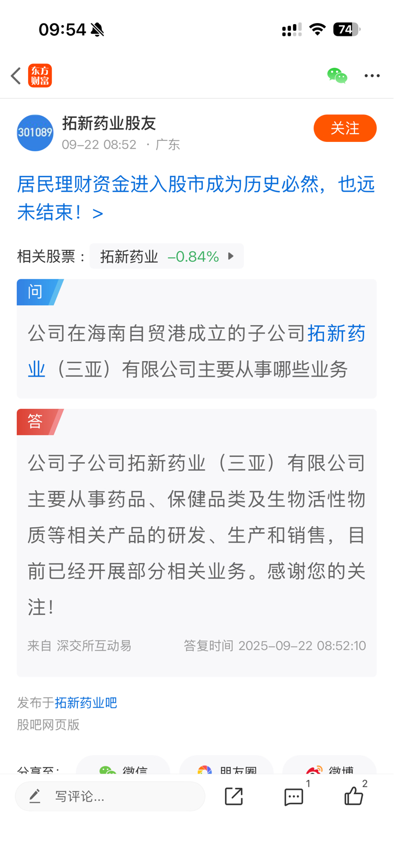 $拓新药业(SZ301089)$ 公司子公司拓新药业(三亚)有限公司主要从事药品、保健品类及生物活性物质等相关产品的研发、生产和销售,目前已经开展部分相关业务。