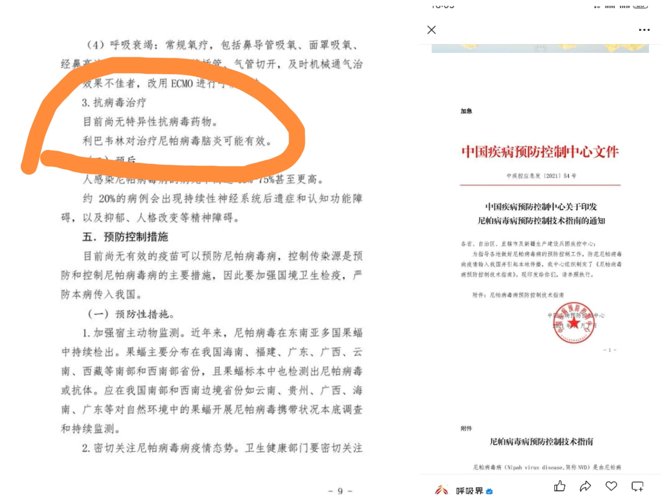 中国疾病预防控制中心关于印发尼帕病毒病预防控制技术指南的通知中明确标明:抗病毒治