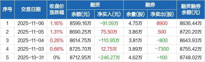 华润材料:融资净偿还91.09万元,融资余额8599.16万元(11-06)