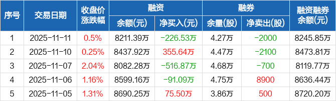 华润材料:融资净偿还226.53万元,融资余额8211.39万元(11-11)