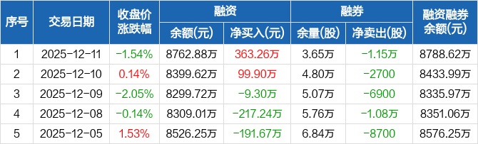 华润材料:融资净买入363.26万元,融资余额8762.88万元(12-11)