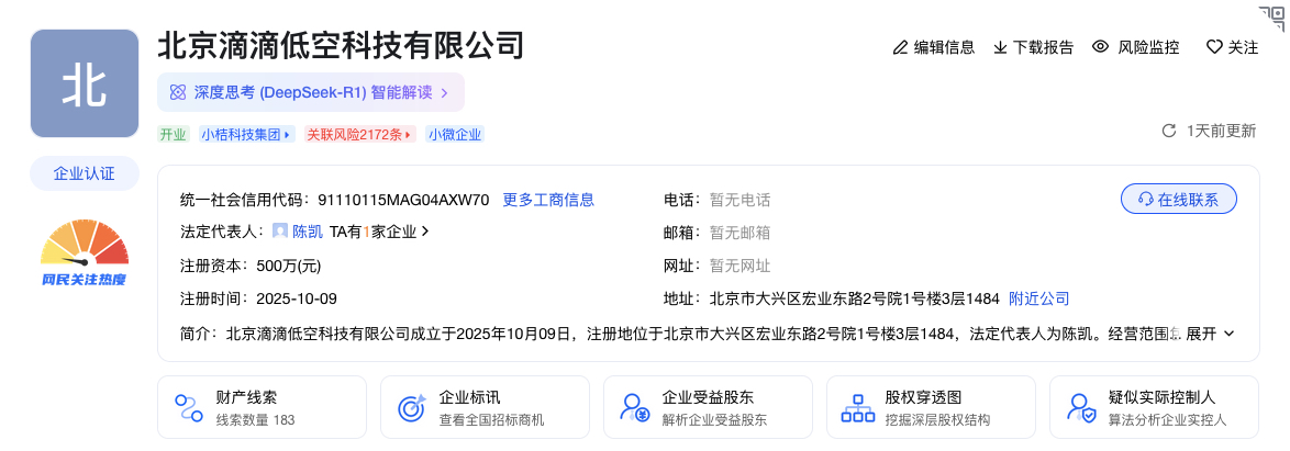2025年10月9日,滴滴出行母公司北京小桔科技集团有限公司全资成立了北京滴滴低空科技有限公司,注册资本500万元,法定代表人为陈凯,经营范围包括社会经济咨询服务、企业管理咨询、软件开发、人工智能应用软件开发等。