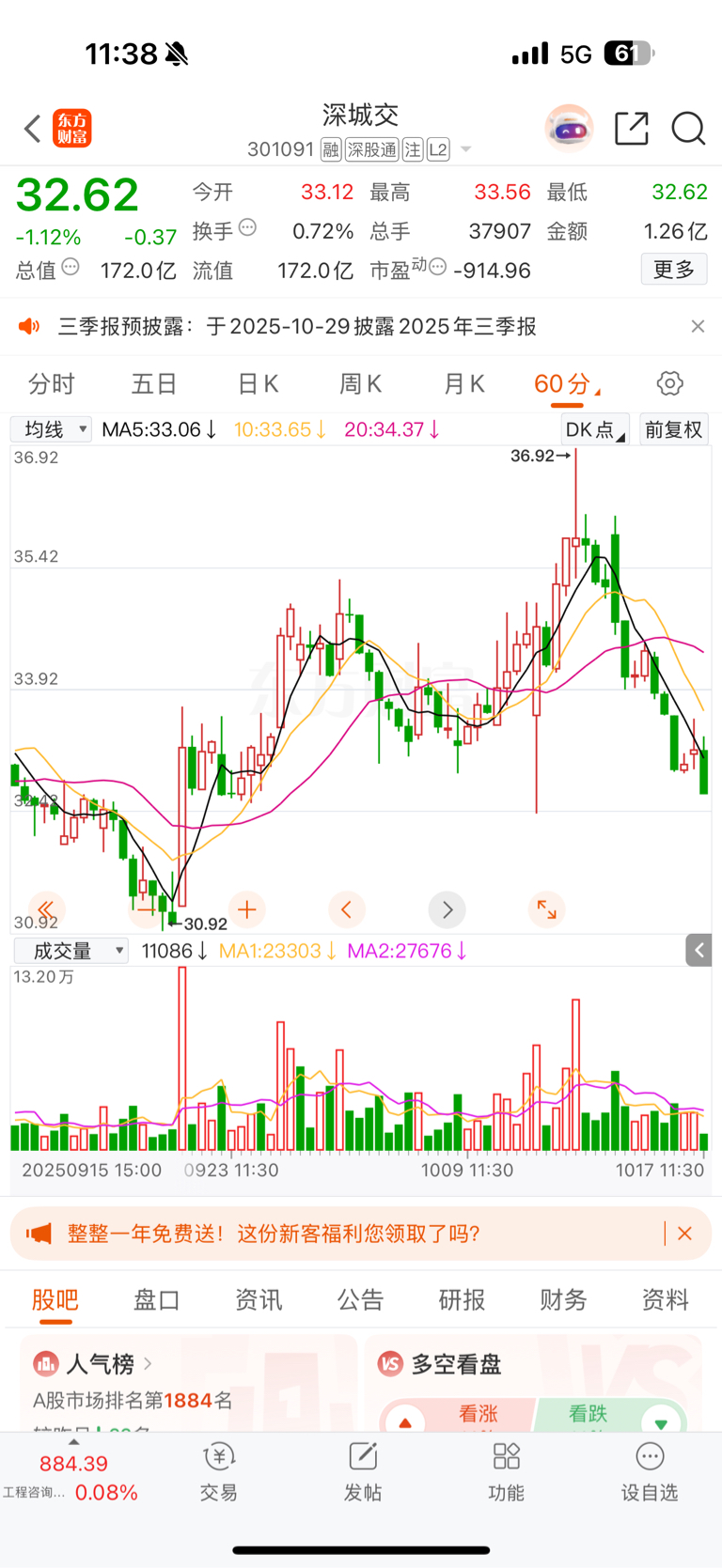 $深城交(SZ301091)$ 这几天大部分票都亏了十几个点,要是高点追进去低点割肉的就更惨了。现在应该放好心态不要追涨杀跌,躺着不动就好了,没打起来就没大问题。看了莱斯和万丰的走势,希望深城交能在32.4止跌反弹