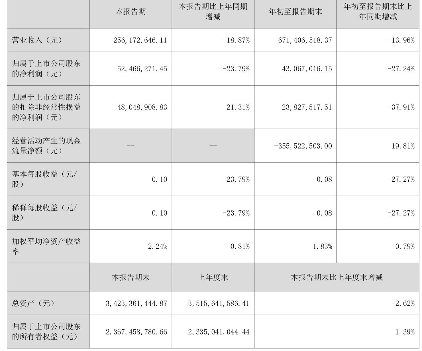 中证智能财讯深城交(301091)10月29日披露2025年第三季度报告。前三季度公司实现营业总收入6.71亿元,同比下降13.96%;归母净利润4306.7万元,同比下降27.24%;扣非净利润2382.75万元,同比下降37.91%;经营活动产生的现金流量净额为-3.56亿元,上年同期为-4.43亿元;报告期内,深城交基本每股收益为0.08元,加权平均净资产收益率为1.83%。