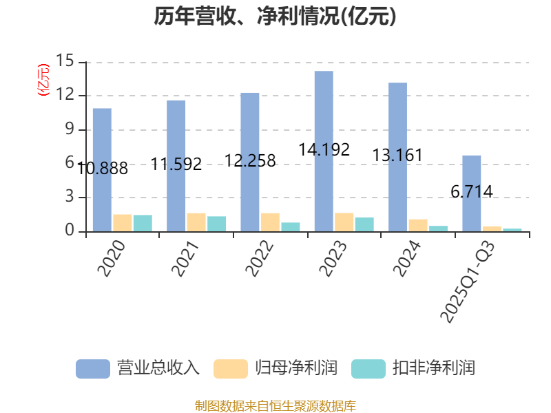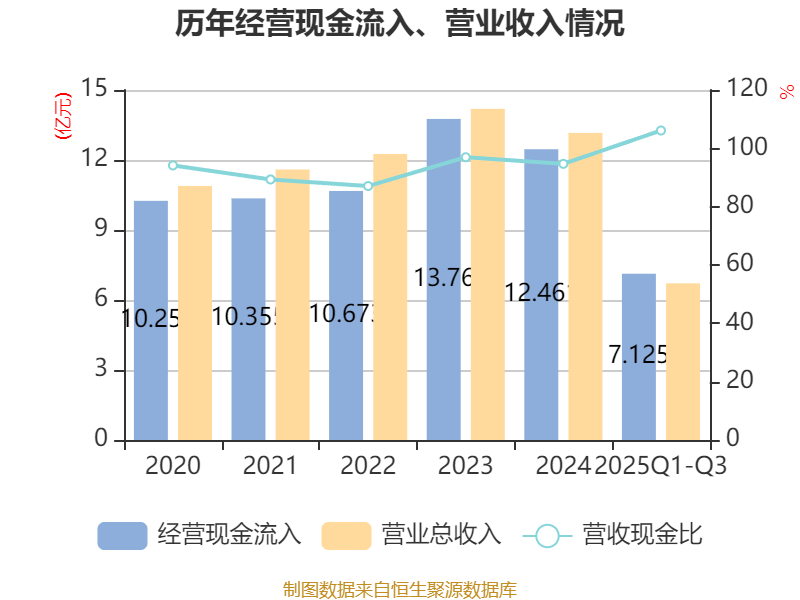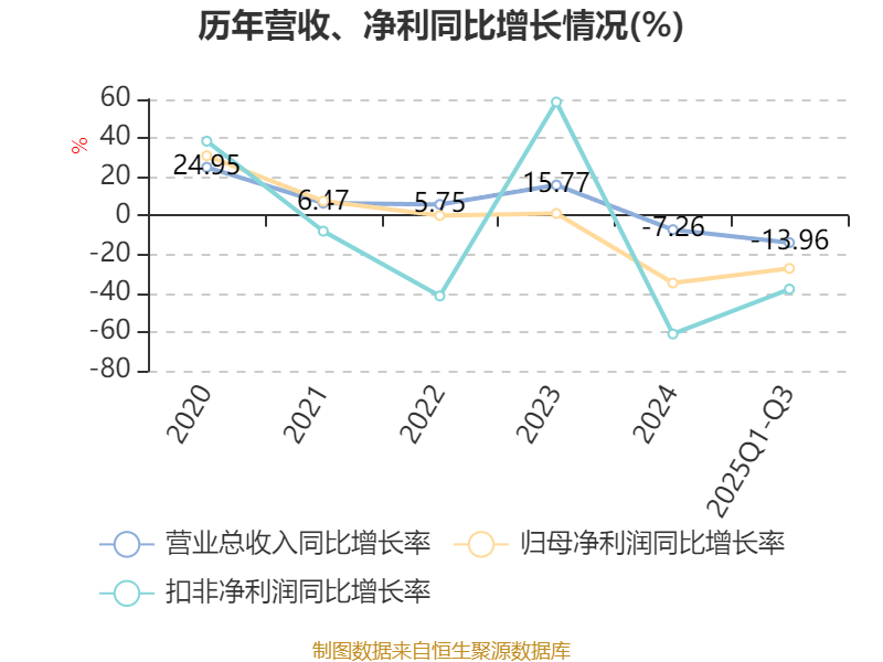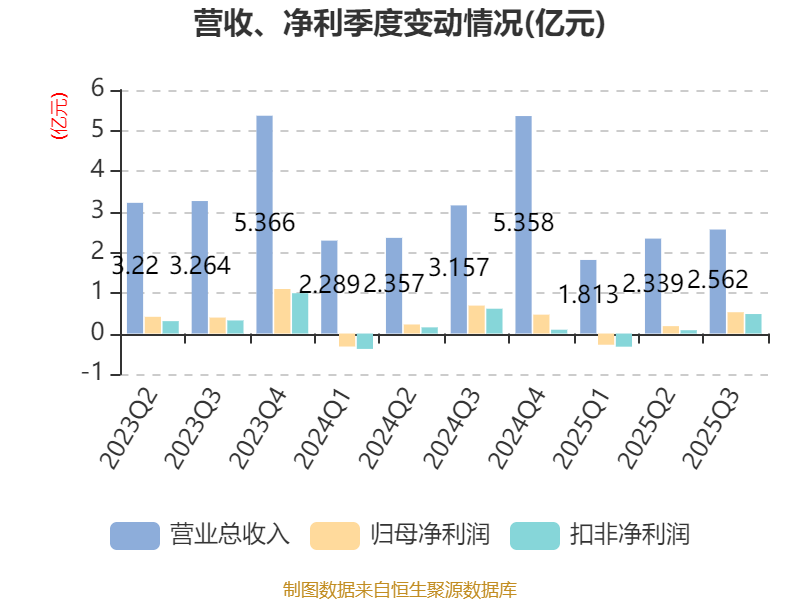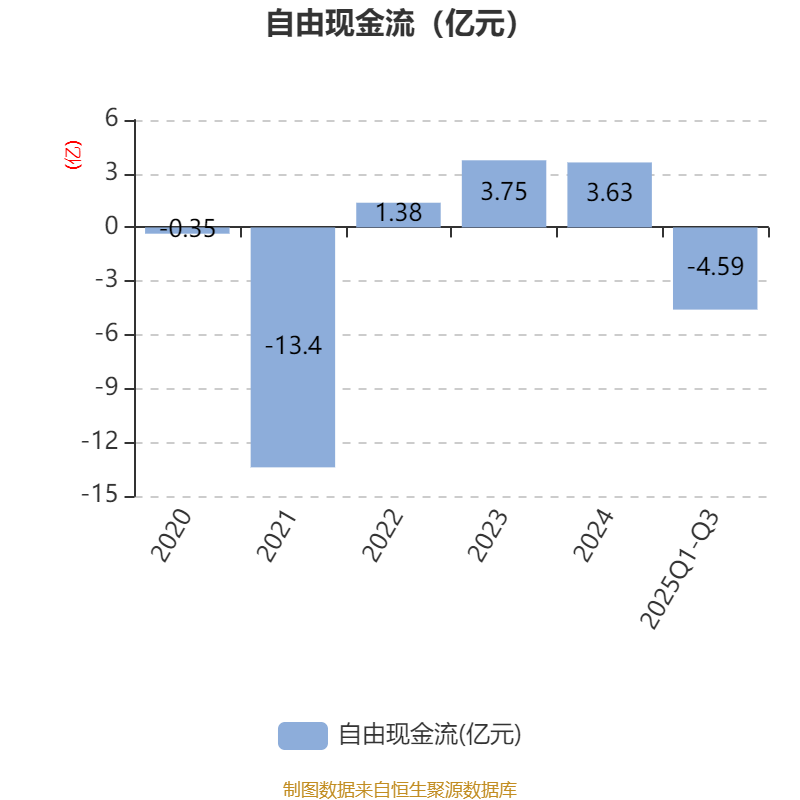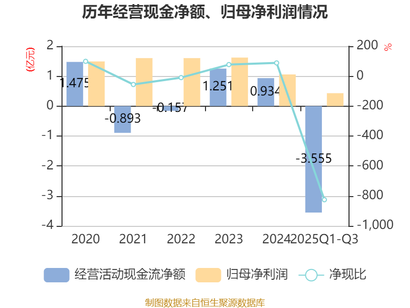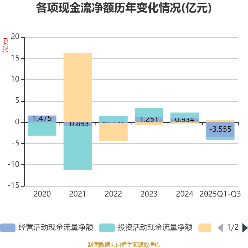2025年前三季度,公司经营活动现金流净额为-3.56亿元,同比增加8783.61万元;筹资活动现金流净额5978.56万元,同比增加8748.15万元;投资活动现金流净额-5924.02万元,上年同期为1.37亿元。