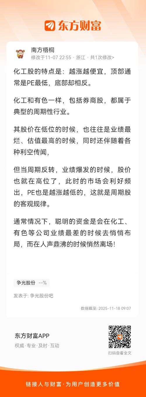 化工股的特点是:越涨越便宜,顶部通常是PE最低,底部却相反。