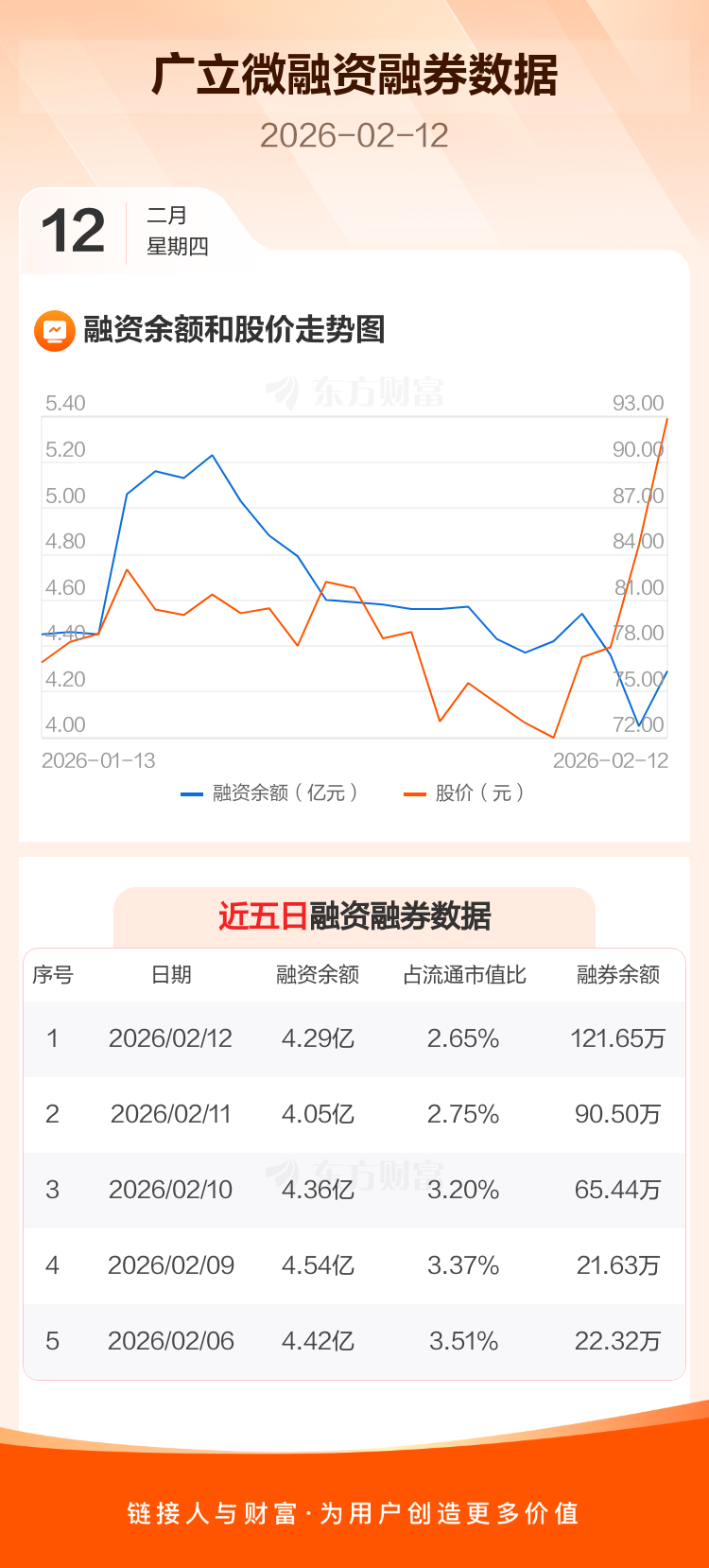 交易所最新数据显示,广立微于2026年2月12日获融资买入1.42亿元,融资偿还1.18亿元,当日融资净买入2376.88万元。目前,该股融资余额4.29亿,占流通市值比例为2.65%。