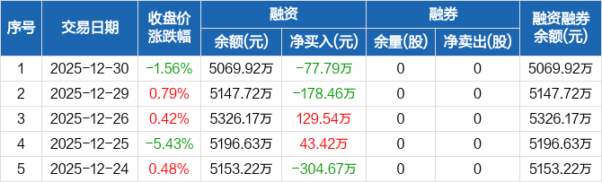 天益医疗:融资净偿还77.79万元,融资余额5069.92万元(12-30)