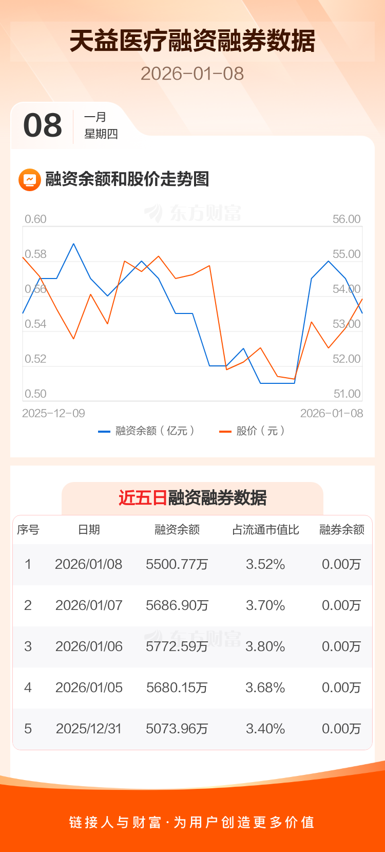 交易所最新数据显示,天益医疗于2026年1月8日获融资买入186.89万元,融资偿还373.02万元,当日融资净偿还186.13万元。目前,该股融资余额5500.77万,占流通市值比例为3.52%。