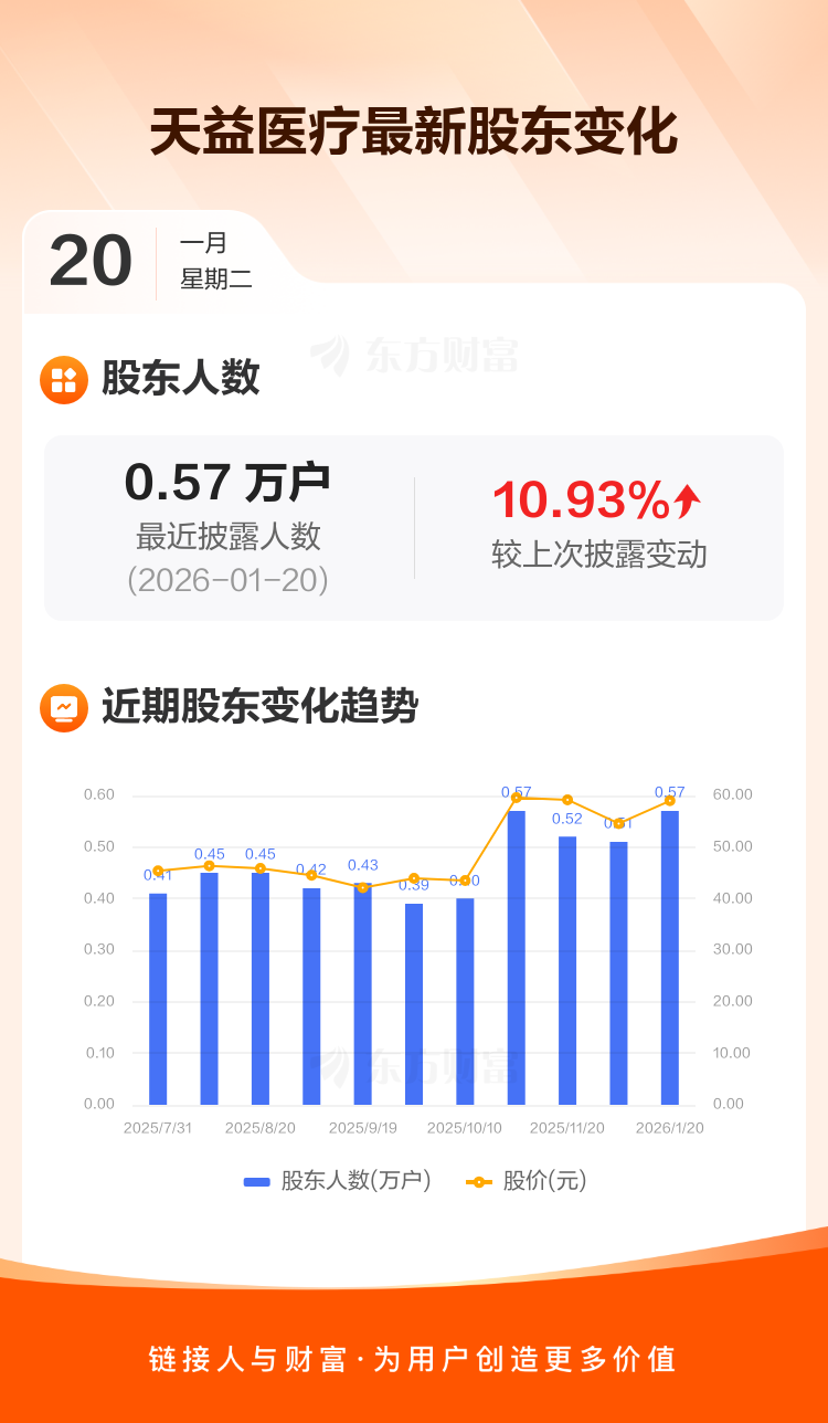 天益医疗最新披露数据显示,截至1月20日公司股东户数为5696户,较上期(2025年12月10日)增加561户,增幅为10.93%。户均持有流通股数量由上期的5637股下降至5080股,户均持股金额由上期的30.76万元减少至29.96万元。