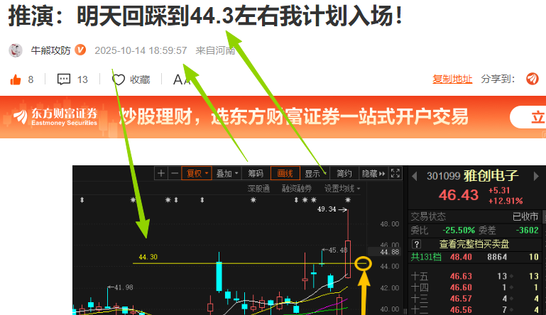 有一个股友给我说,这票错了一点点没进去,要是昨天再跌一点点就进去了;做股票没有那么多要是,我也没进去。错过了18%左右的短线盈利计划!友情提示一下喜欢短线的股友,股价是波动的,平时K线振幅大的,我推演错1%正常,平时K线波动小的,会更精准一些。