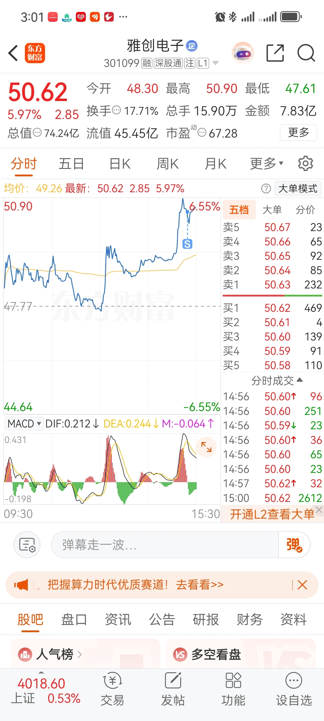$雅创电子(SZ301099)$ 先走了,好像走的不对,明天再看情况咯