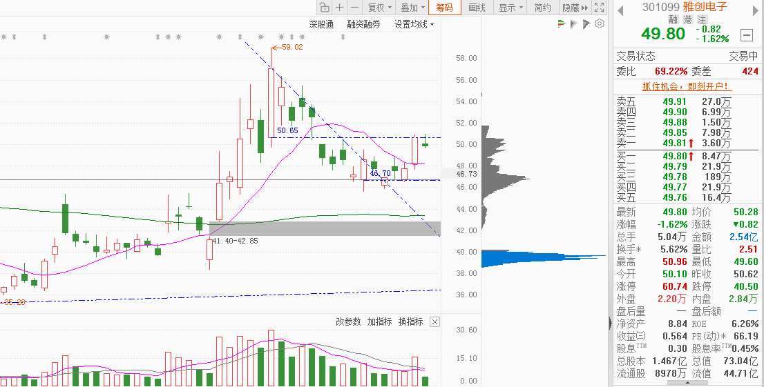 看懂了,就知道今天的震荡是必然的。上周五说了,需要来一根放量阳线,冲到50附近,昨天达到了,如果昨天早盘就直接冲到50,然后下午收回就好了,尾盘冲上来,就有点弱,所以今天必然是震荡的,现在的趋势就是以反弹看待,如果能站稳50.66,那就重回升势,如果昨天这根阳线底部跌穿,那就又重新回到下跌趋势。