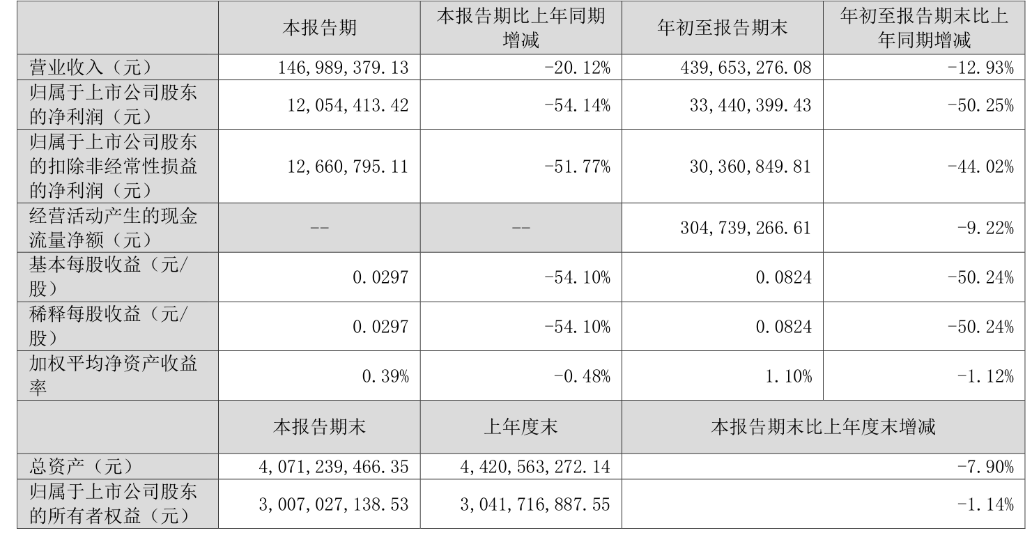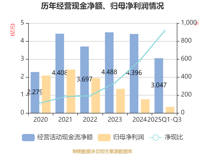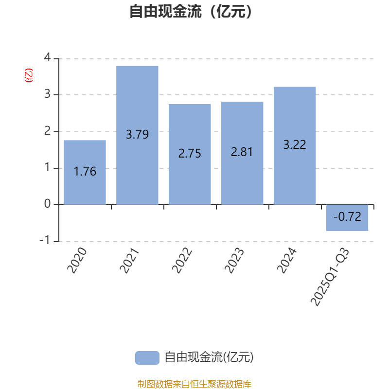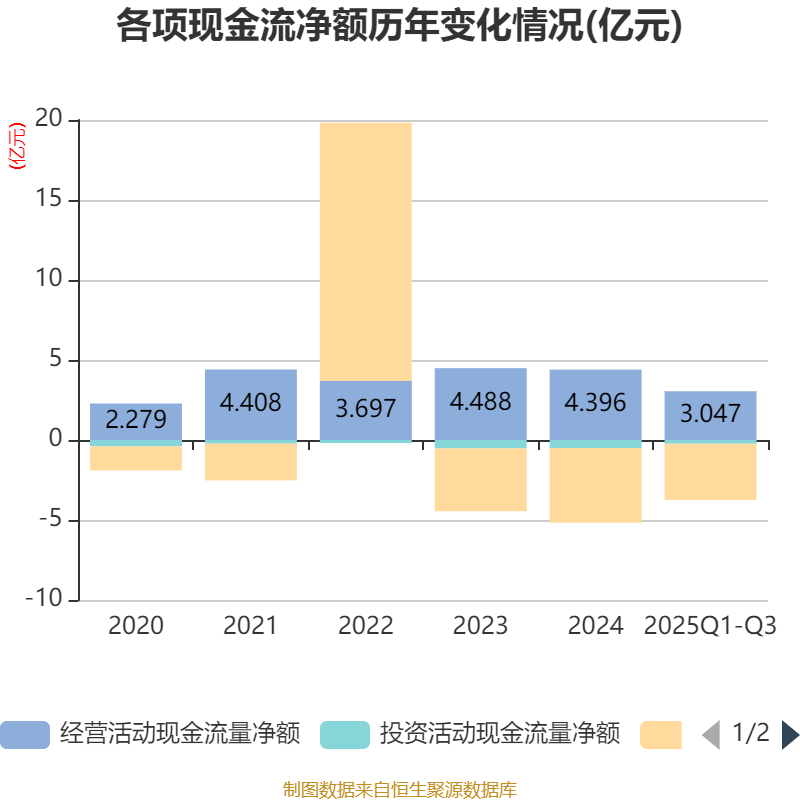 2025年前三季度,公司经营活动现金流净额为3.05亿元,同比下降9.22%;筹资活动现金流净额-3.51亿元,同比增加458.19万元;投资活动现金流净额-2335.82万元,上年同期为-3730.8万元。