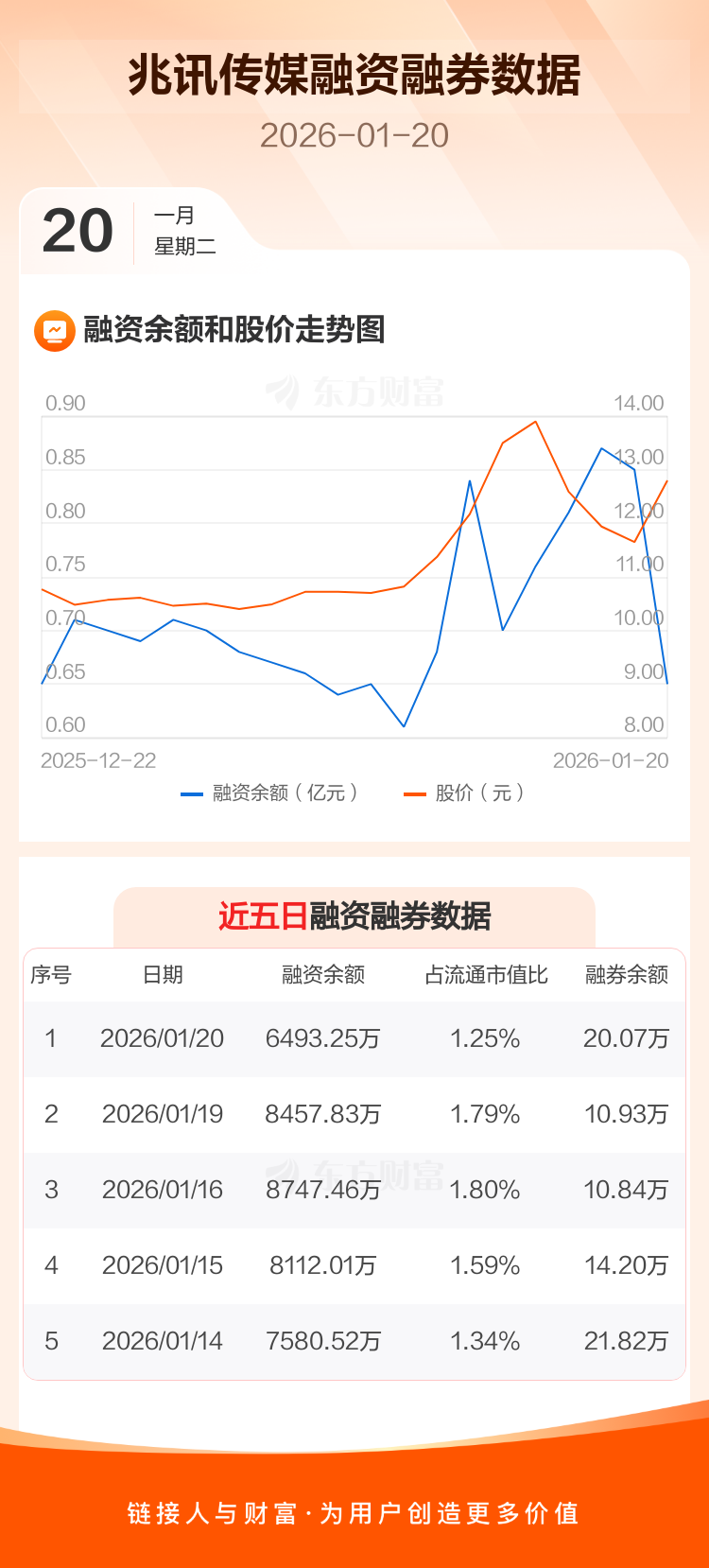 交易所最新数据显示,兆讯传媒于2026年1月20日获融资买入3677.10万元,融资偿还5641.68万元,当日融资净偿还1964.58万元。目前,该股融资余额6493.25万,占流通市值比例为1.25%。