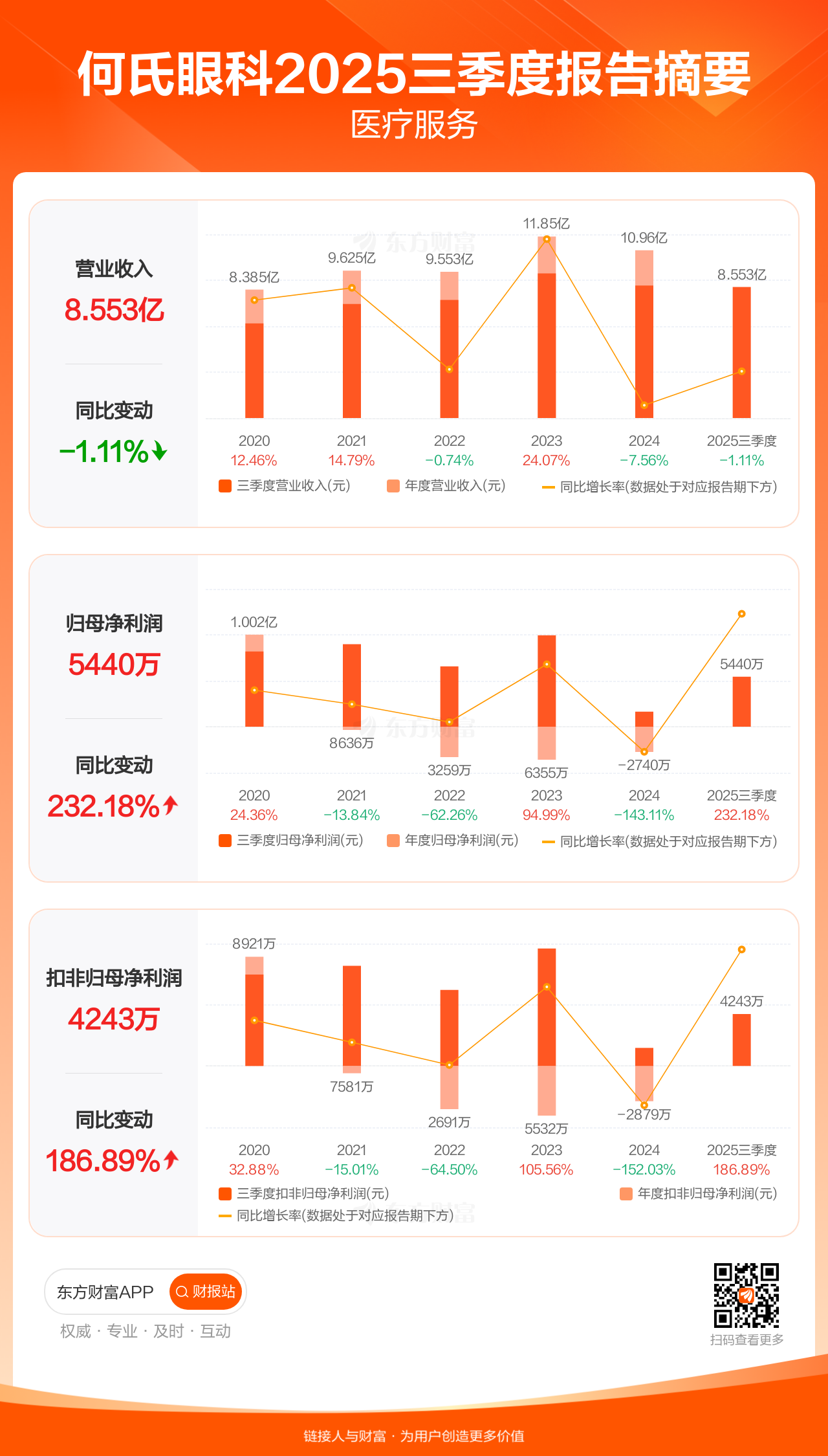 何氏眼科10月30日发布2025年三季报显示,公司前三季实现营业收入8.55亿元,同比下滑1.11%;归母净利润5439.53万元,同比增长232.18%;扣非归母净利润4242.87万元,同比增长186.89%。