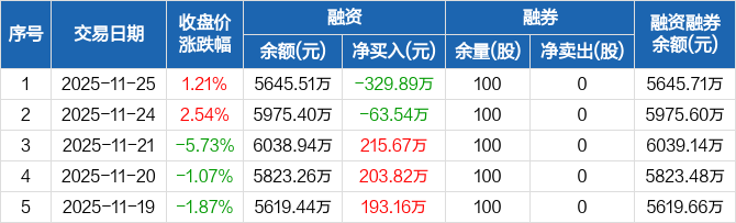 融资方面,当日融资买入197.04万元,融资偿还526.93万元,融资净偿还329.89万元。融券方面,融券卖出0股,融券偿还0股,融券余量100股,融券余额2084元。融资融券余额合计5645.71万元。
