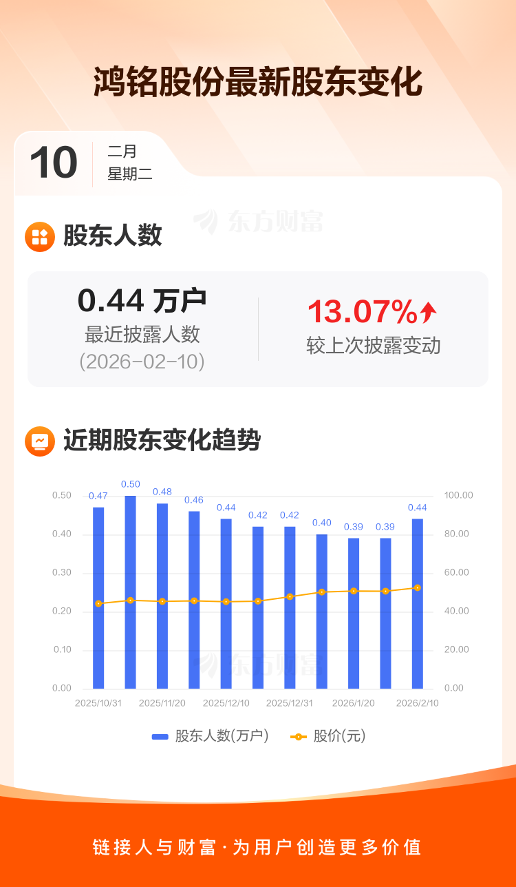 鸿铭股份最新披露数据显示,截至2月10日公司股东户数为4396户,较上期(2026年1月30日)增加508户,增幅为13.07%。户均持有流通股数量由上期的4227股下降至3739股,户均持股金额由上期的21.38万元减少至19.57万元。