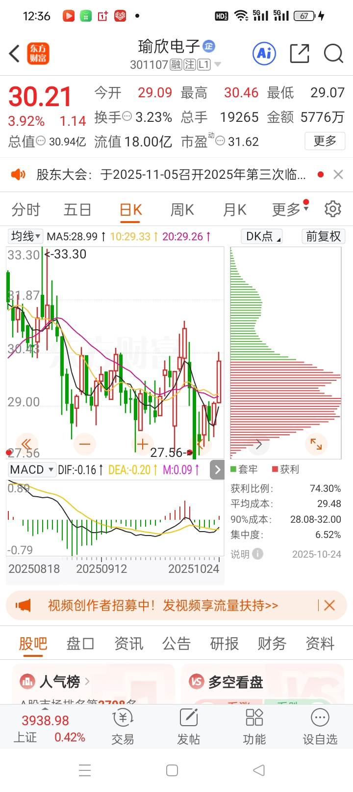 $瑜欣电子(SZ301107)$ KDJ金叉。MACD金叉。零轴突破。筹码峰为建仓峰。全仓买入。稳赚!