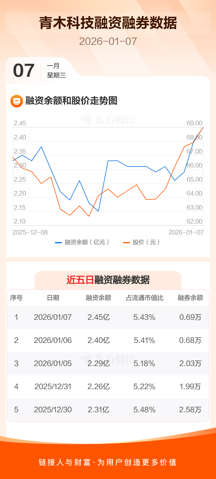 交易所最新数据显示,青木科技于2026年1月7日获融资买入1771.66万元,融资偿还1318.31万元,当日融资净买入453.34万元。目前,该股融资余额2.45亿,占流通市值比例为5.43%。