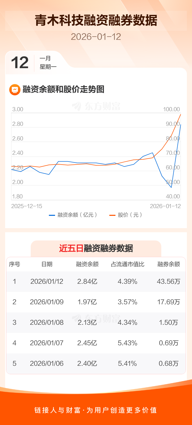 交易所最新数据显示,青木科技于2026年1月12日获融资买入1.90亿元,融资偿还1.03亿元,当日融资净买入8737.63万元。目前,该股融资余额2.84亿,占流通市值比例为4.39%。