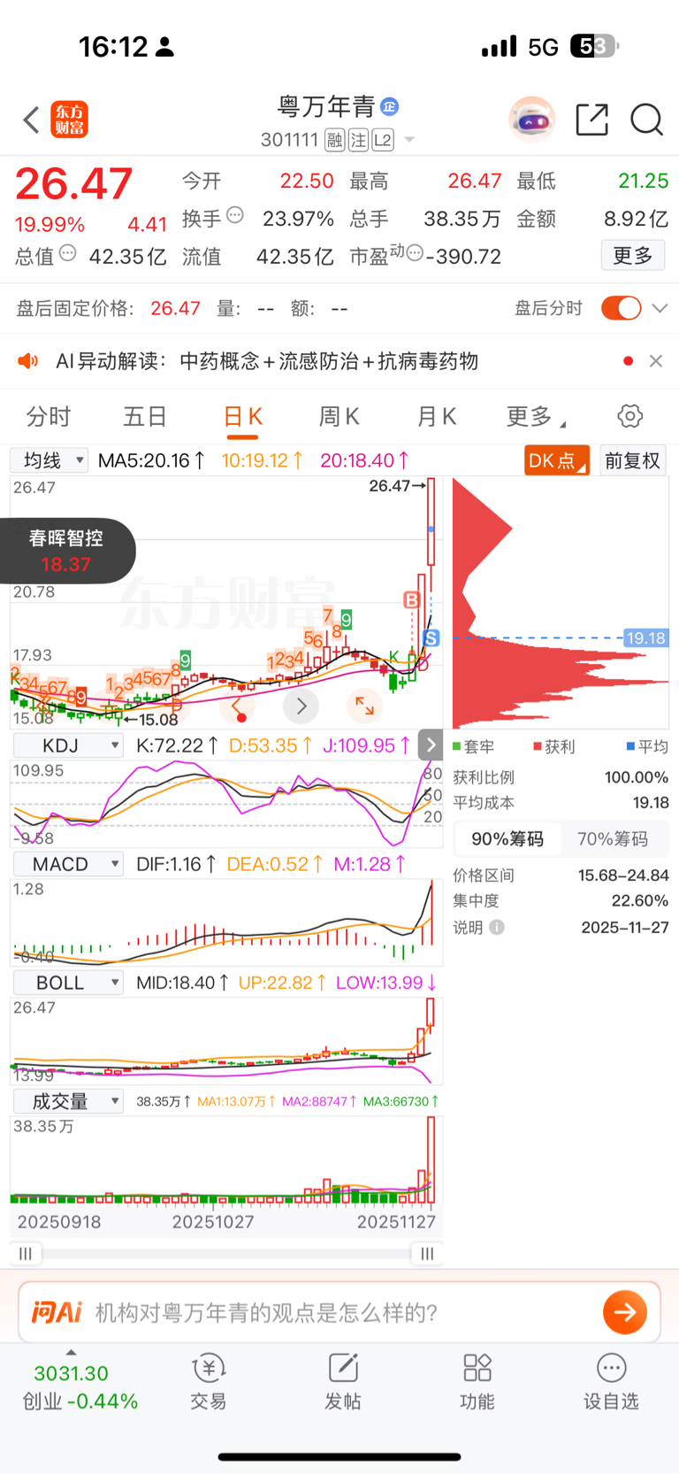 $粤万年青(SZ301111)$ #炒股日记# 前天买入,今天卖飞!后面的钱不是我该赚的,虽然会有点小后悔,更希望可以克制自己的贪念