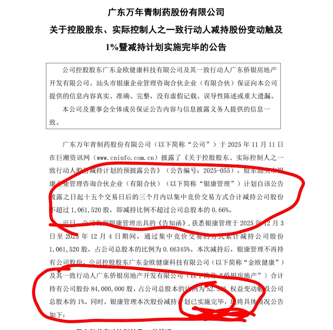 完事了,完事了,完事了。银康和侨银都减持完了。4号当天就已实施完毕。我们现在跌32%了,游资大佬们可以关注我们粤万年青了,我们现在极有性价比。