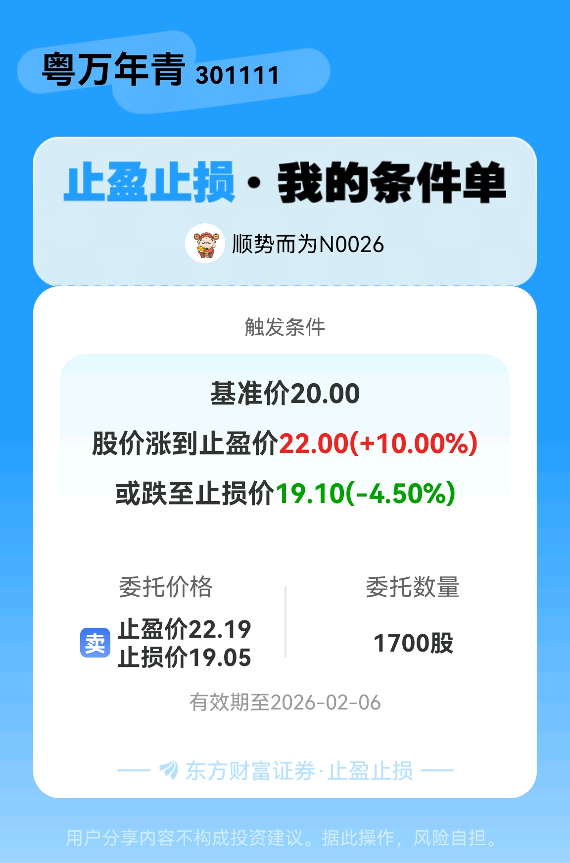 #条件单交流# #止盈止损晒单# 一位股神设置了一个止盈止损条件单,接下来就是见证奇迹的时刻~$粤万年青(SZ301111)$