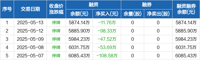 融资方面,当日融资买入0元,融资偿还11.76万元,融资净偿还11.76万元,连续6日净偿还累计862.32万元。融券方面,融券卖出0股,融券偿还0股,融券余量0股,融券余额0元。融资融券余额合计5874.14万元。