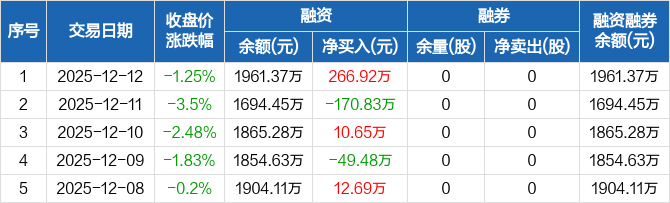 雅艺科技:融资净买入266.92万元,融资余额1961.37万元(12-12)