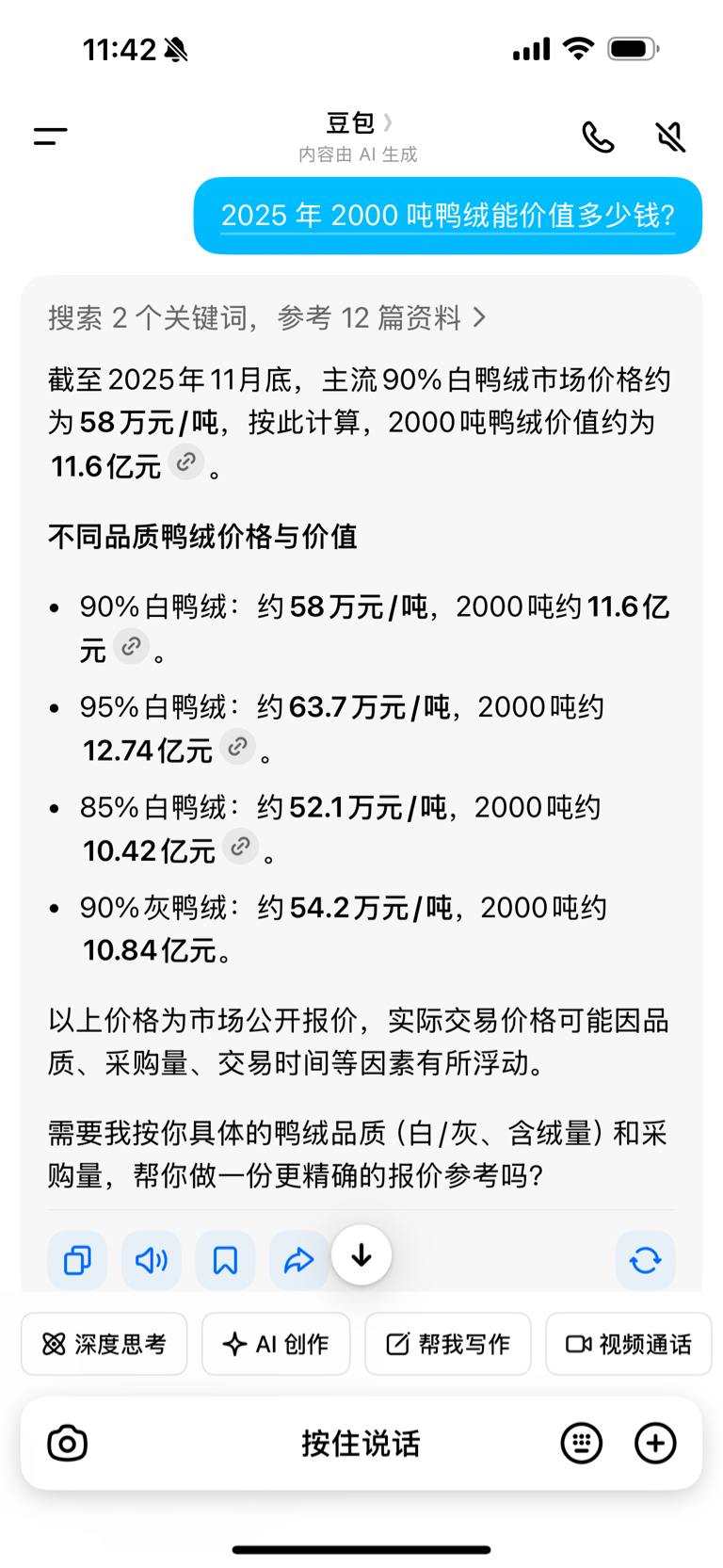 $益客食品(SZ301116)$ 2000吨鸭绒值多少钱?