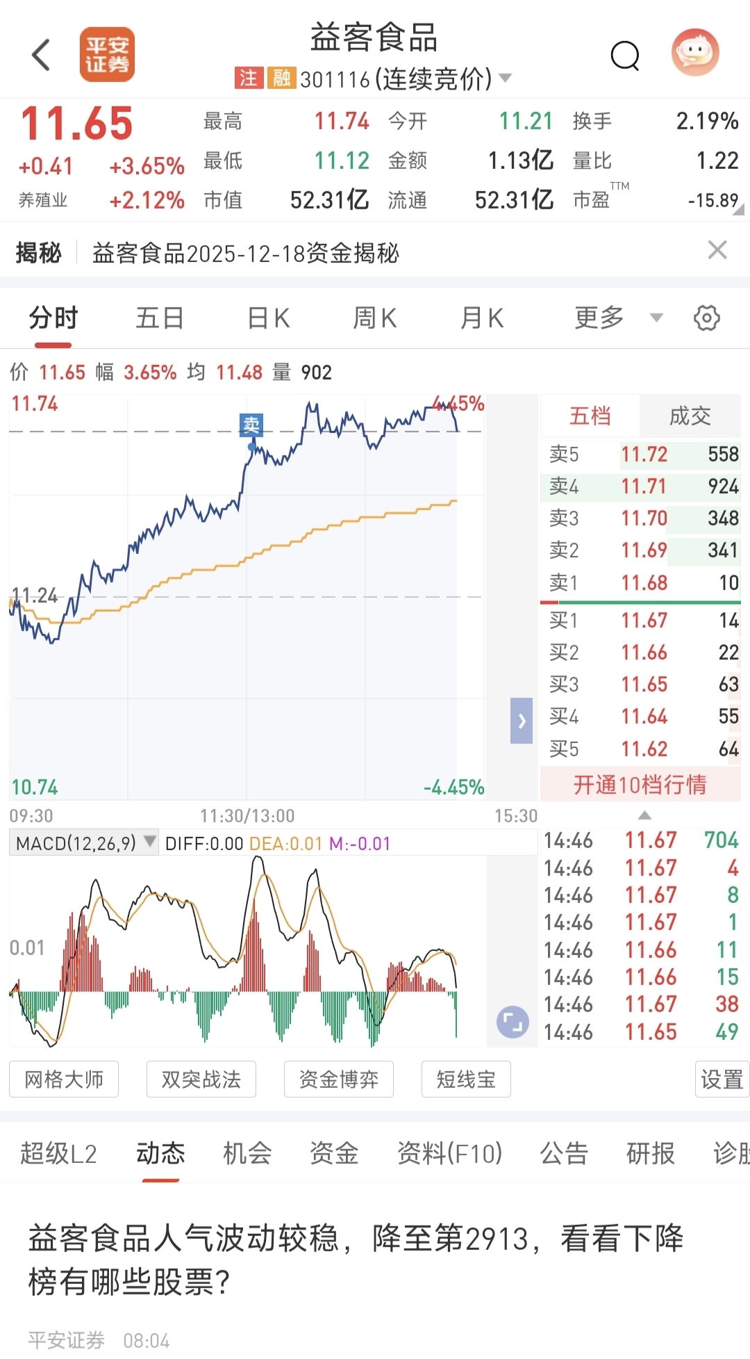 $益客食品(SZ301116)$ 清仓不后悔,全是大卖单,会跌破11的