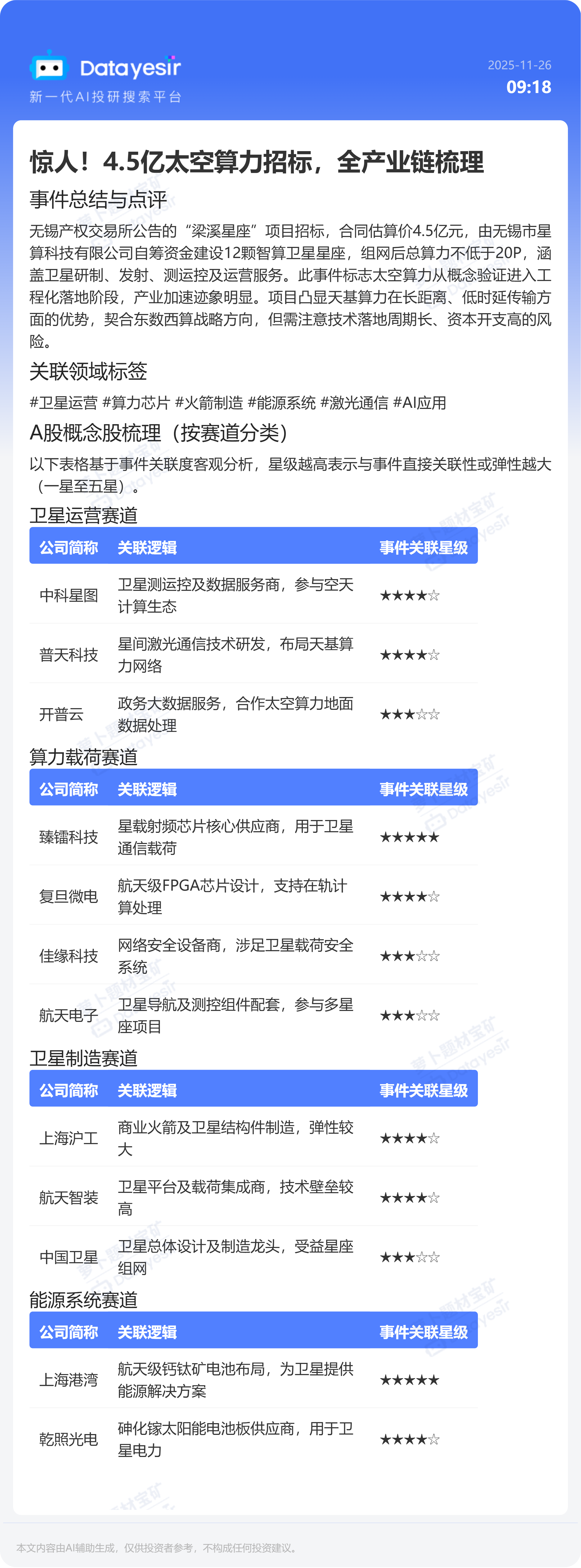 无锡产权交易所公告的“梁溪星座”项目招标,合同估算价4.5亿元,由无锡市星算科技有限公司自筹资金建设12颗智算卫星星座,组网后总算力不低于20P,涵盖卫星研制、发射、测运控及运营服务。此事件标志太空算力从概念验证进入工程化落地阶段,产业加速迹象明显。