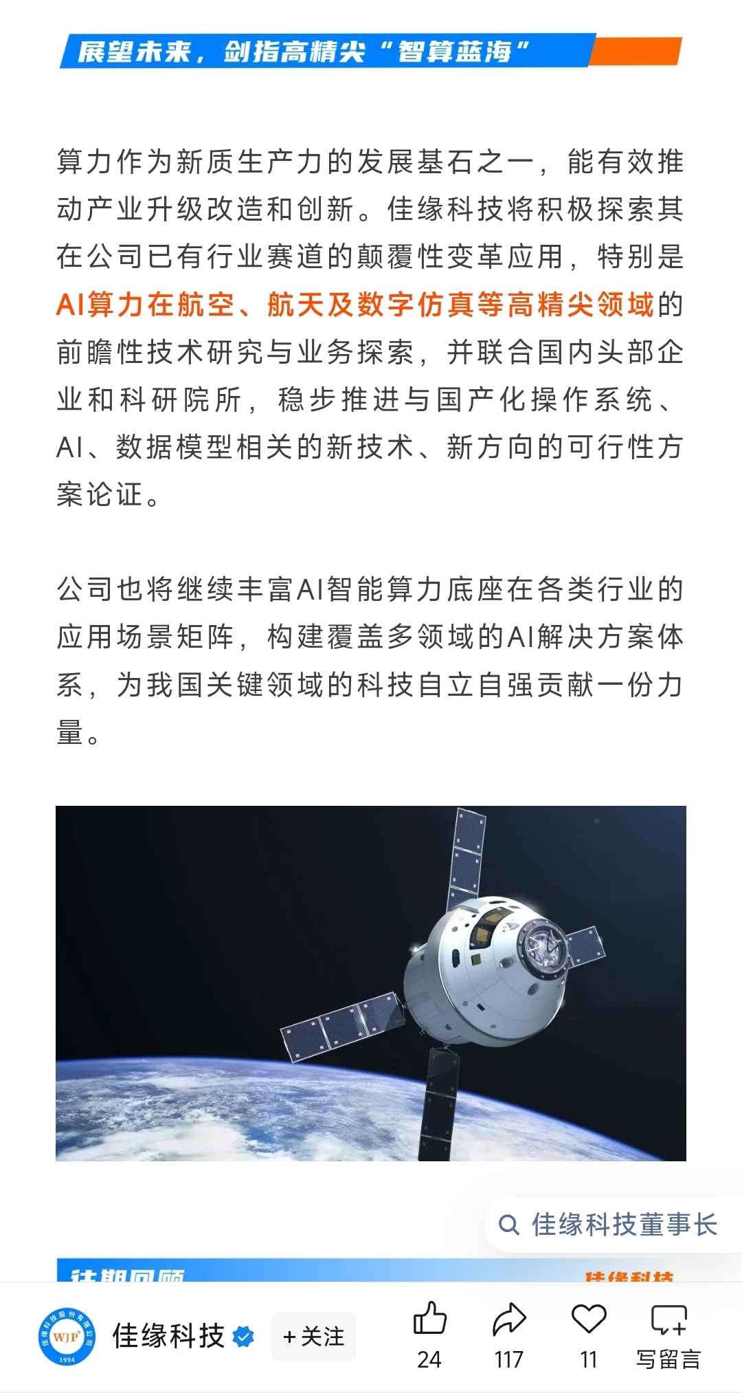 佳缘科技将积极探索其在公司已有行业赛道的颠覆性变革应用,特别是AI算力在航空、航天及数字仿真等高精尖领域的前瞻性技术研究与业务探索。