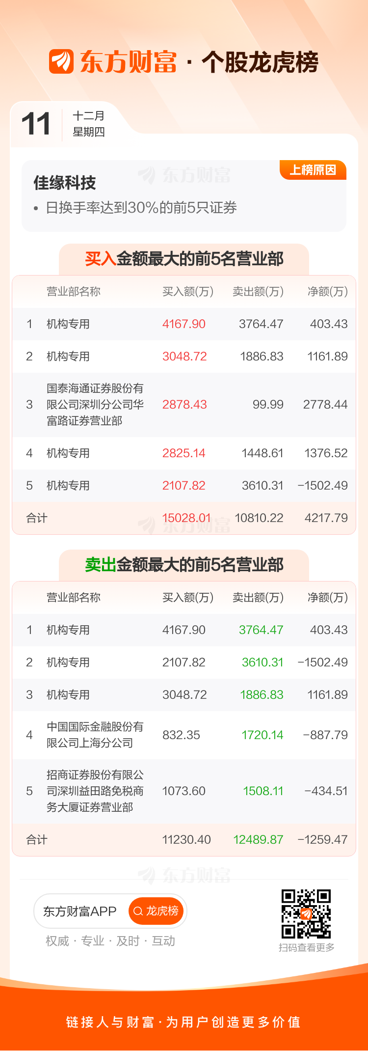 交易所2025年12月11日公布的交易公开信息显示,佳缘科技因成为日换手率达到30%的前5只证券上榜。佳缘科技当日收报55.21元,涨跌幅7.00%,偏离值33.72%,换手率33.72%,成交额14.62亿。