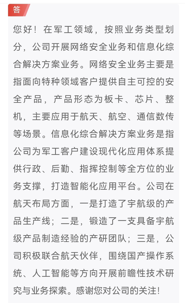 4、据2025年8月28日半年度报告,公司主营特种行业网络信息安全产品,产品用于航天、航空、地面等领域,在民营网安企业中占据优势地位。